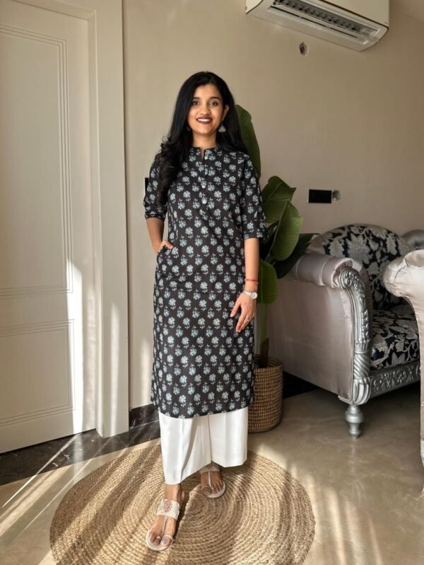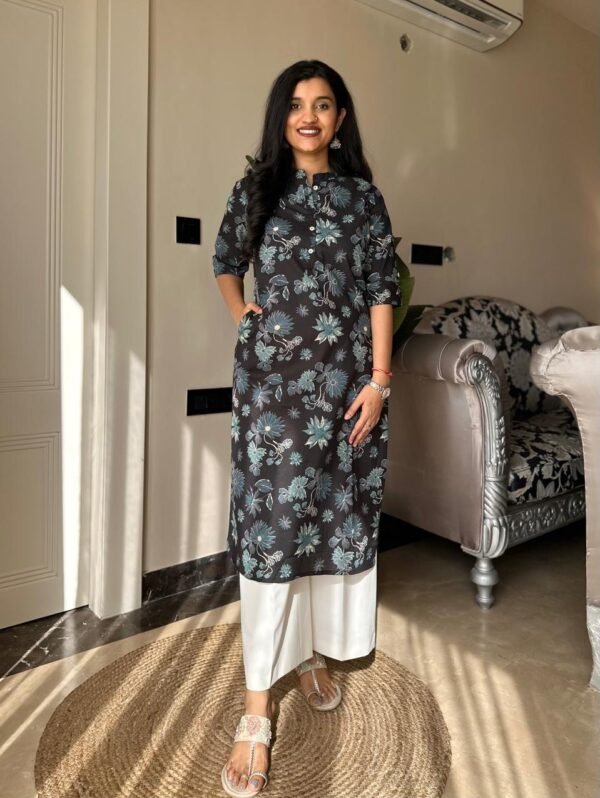 Weekend Cotton Kurta- Black Blue Florals