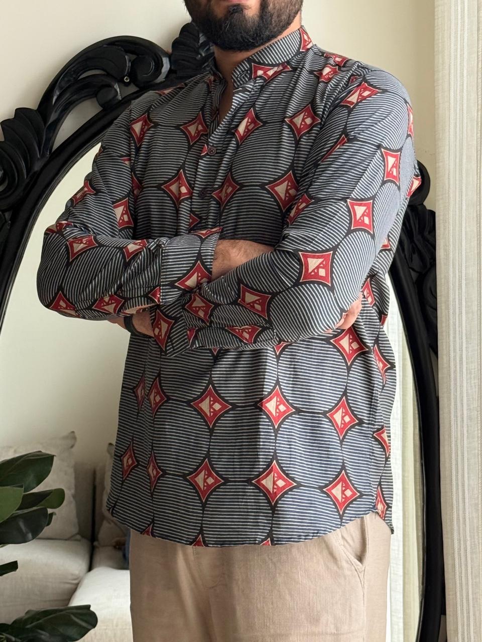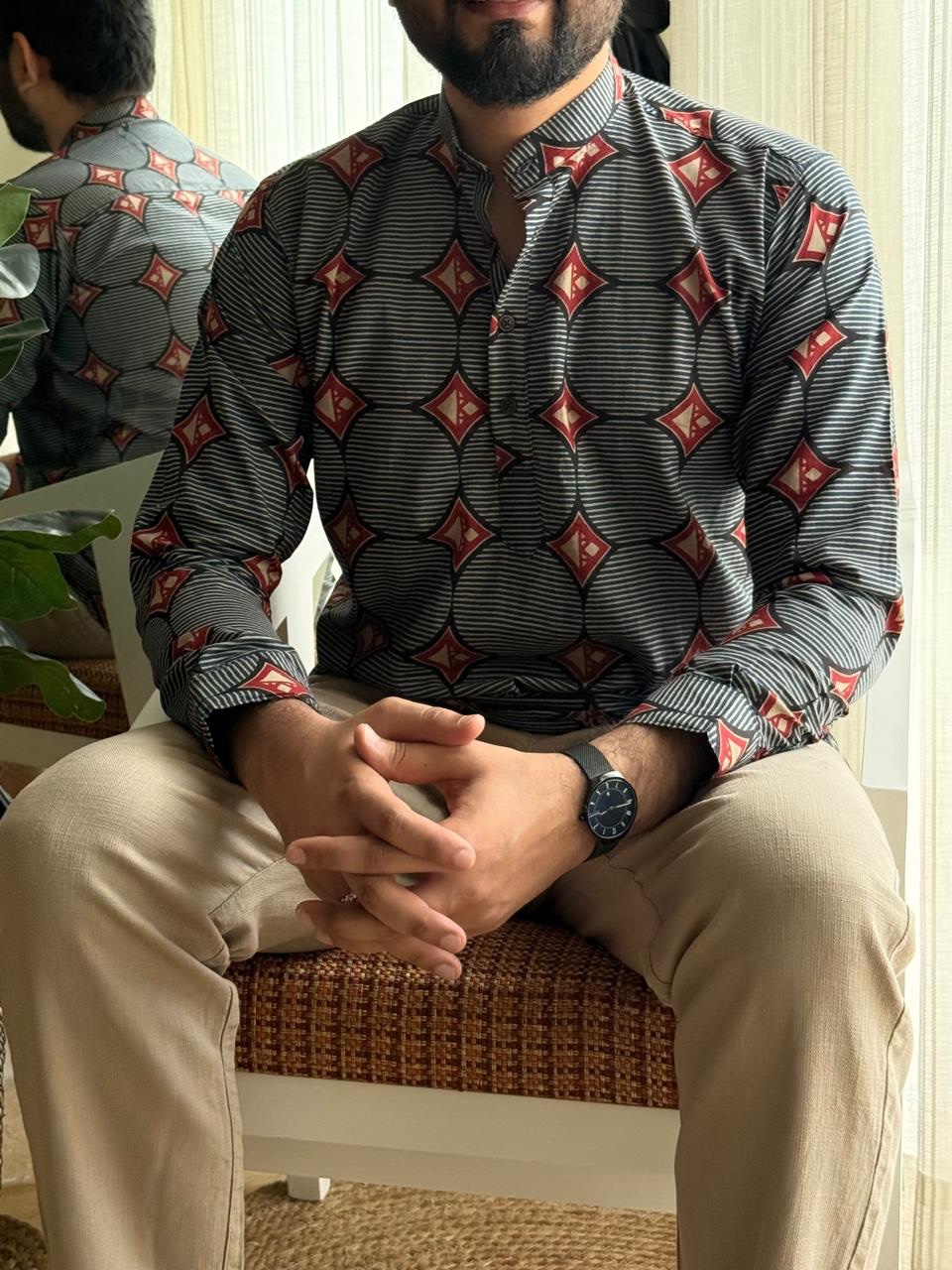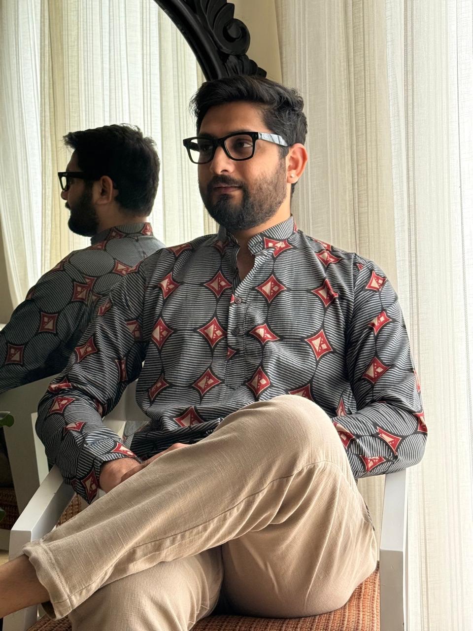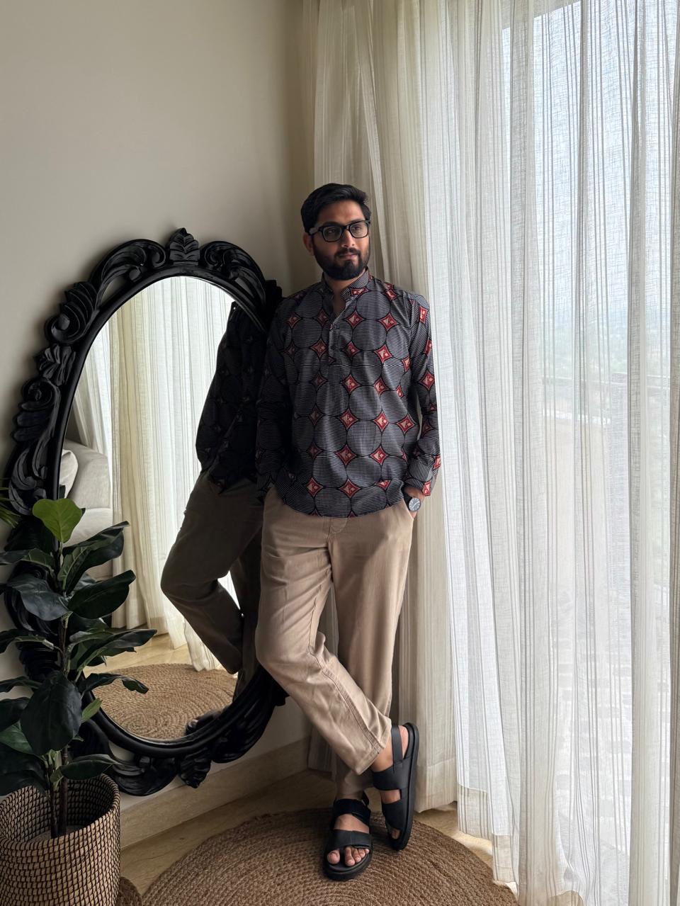 Cotton Men’s Short Kurta- Black Abstract