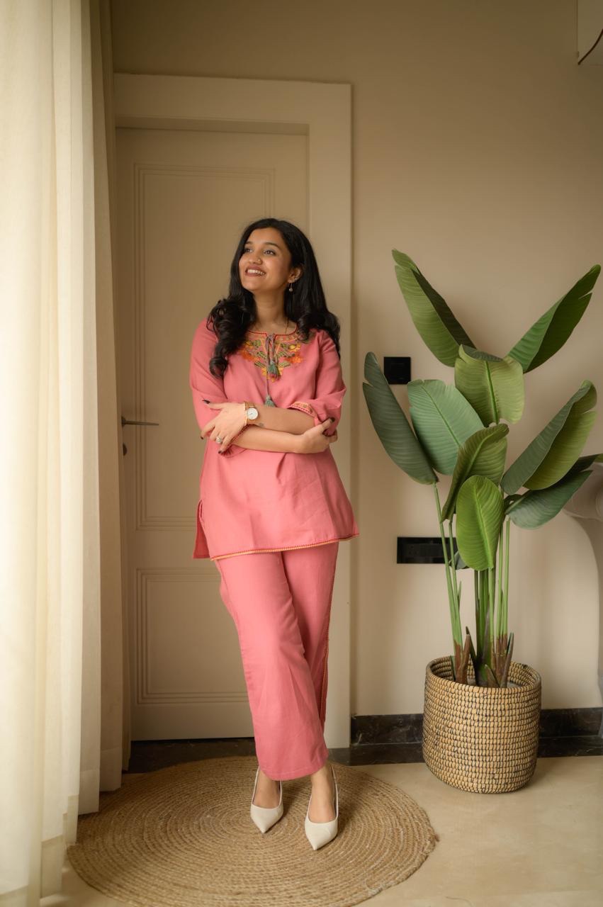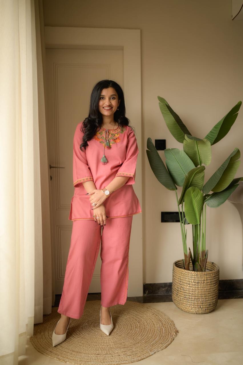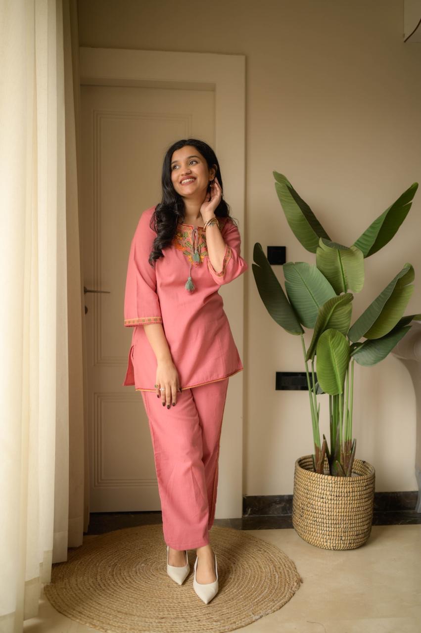 Crafted in Slub Cotton, these co-ord sets feature refined embroidery on the yoke and sleeves — bringing comfort, luxury, and style together in one silhouette.