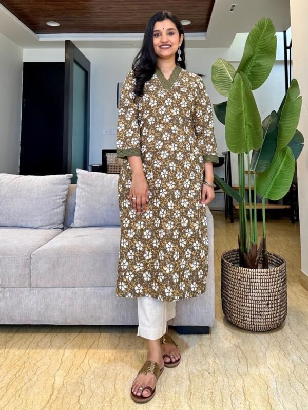 Muslin V-Neck Leheriya Kurta- Green Grey