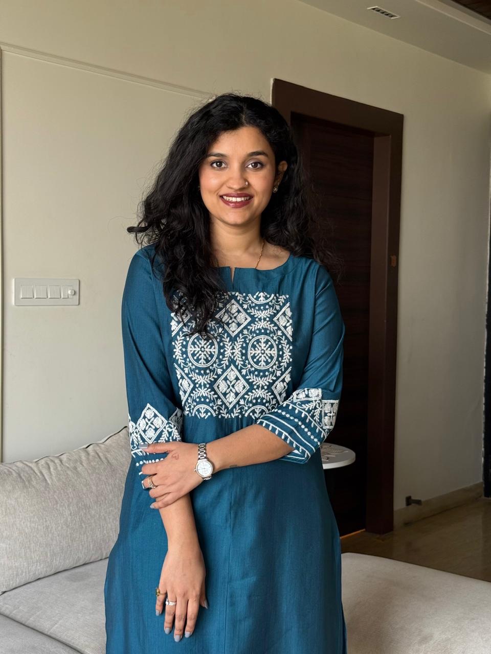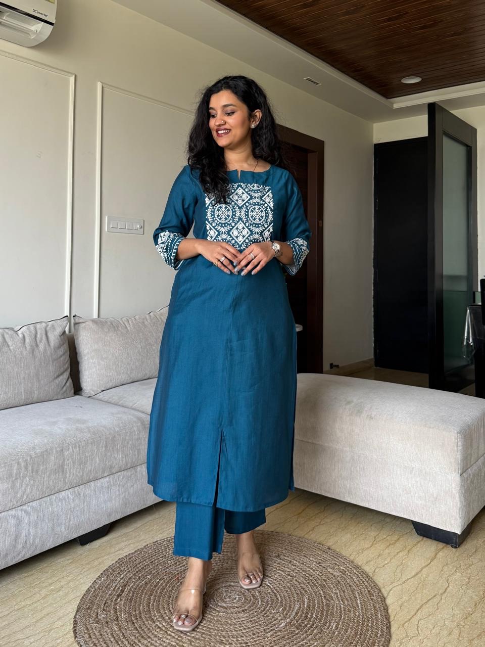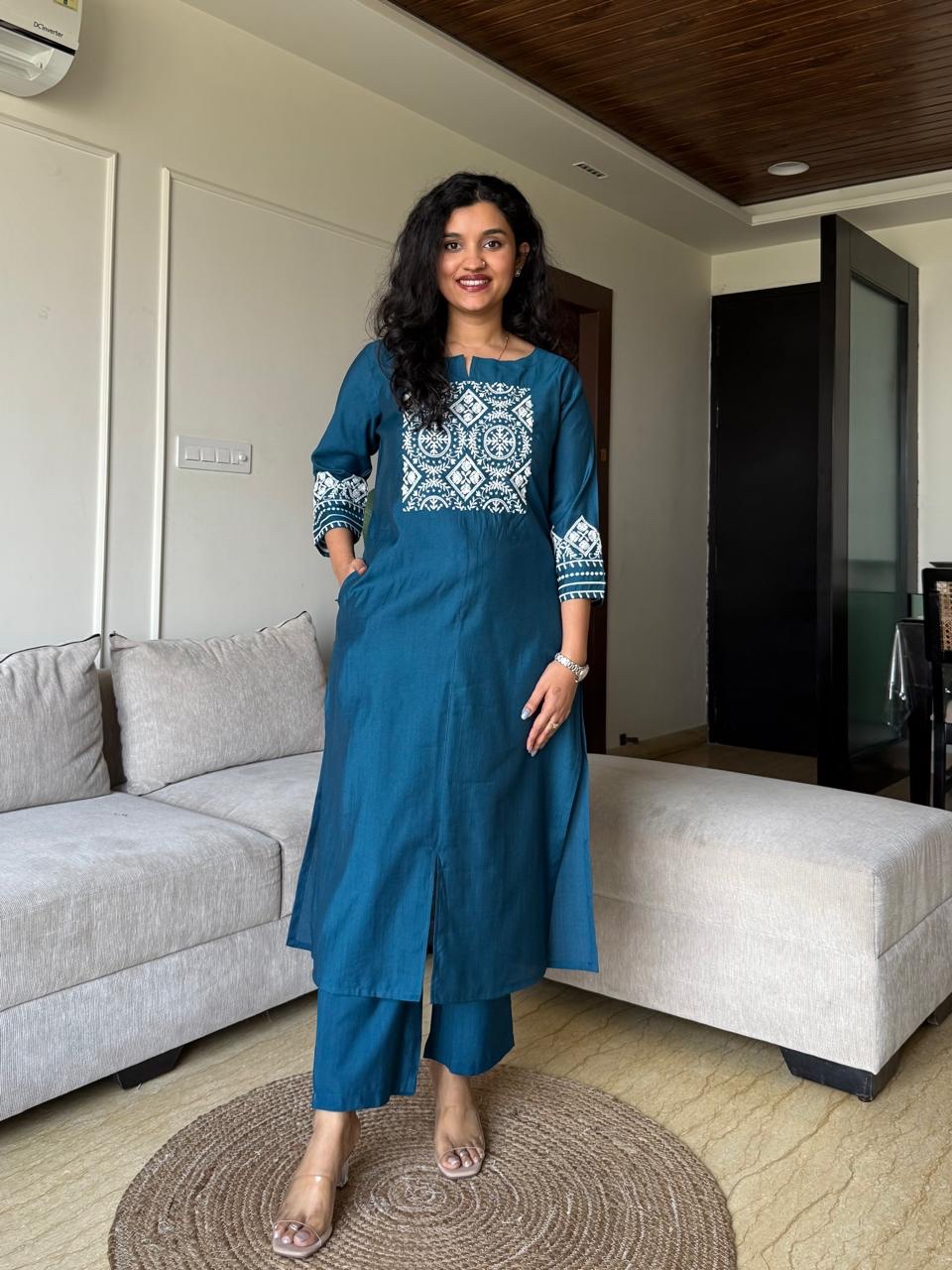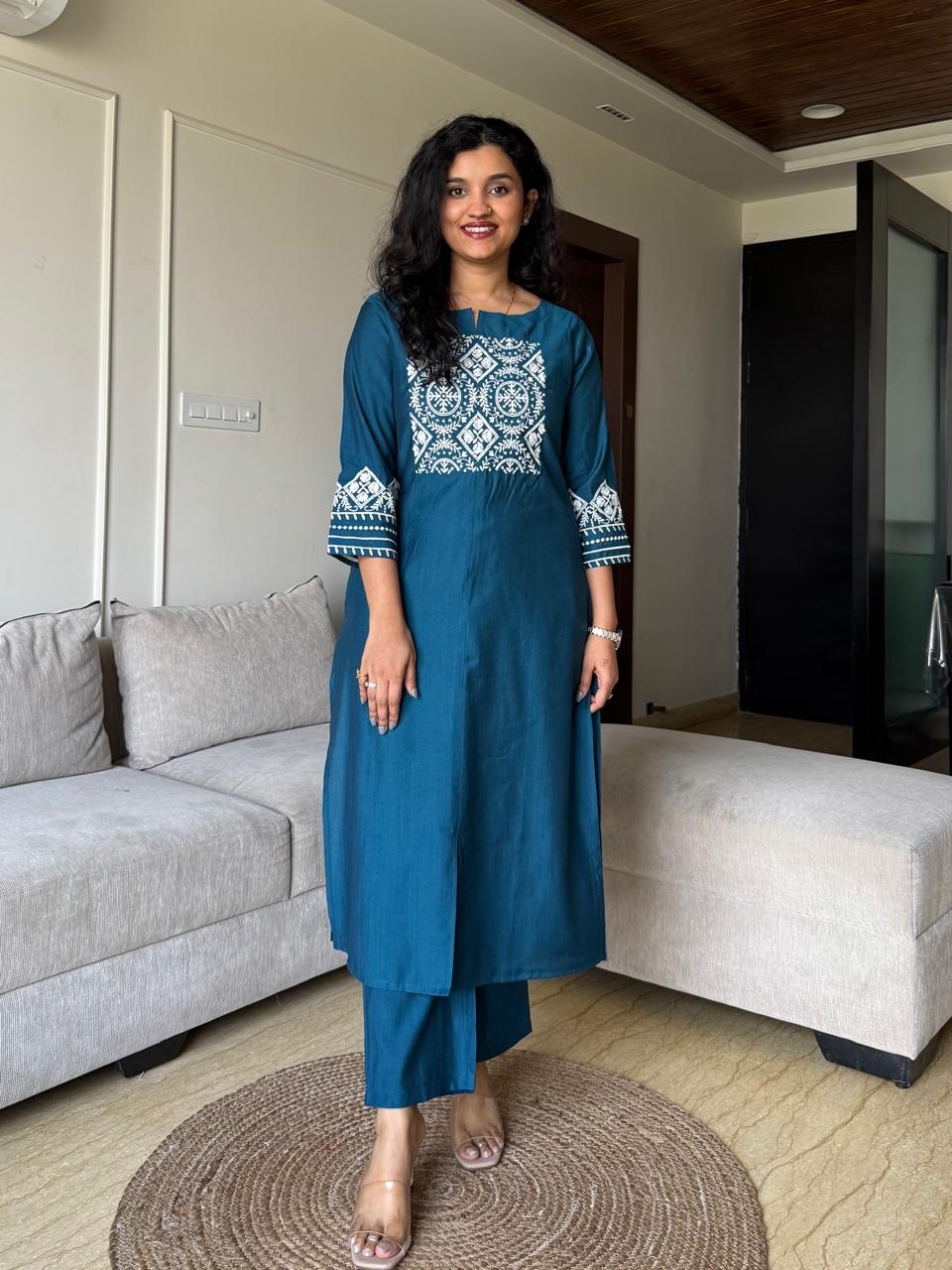 Neer Embroidered Straight Set- Teal Blue