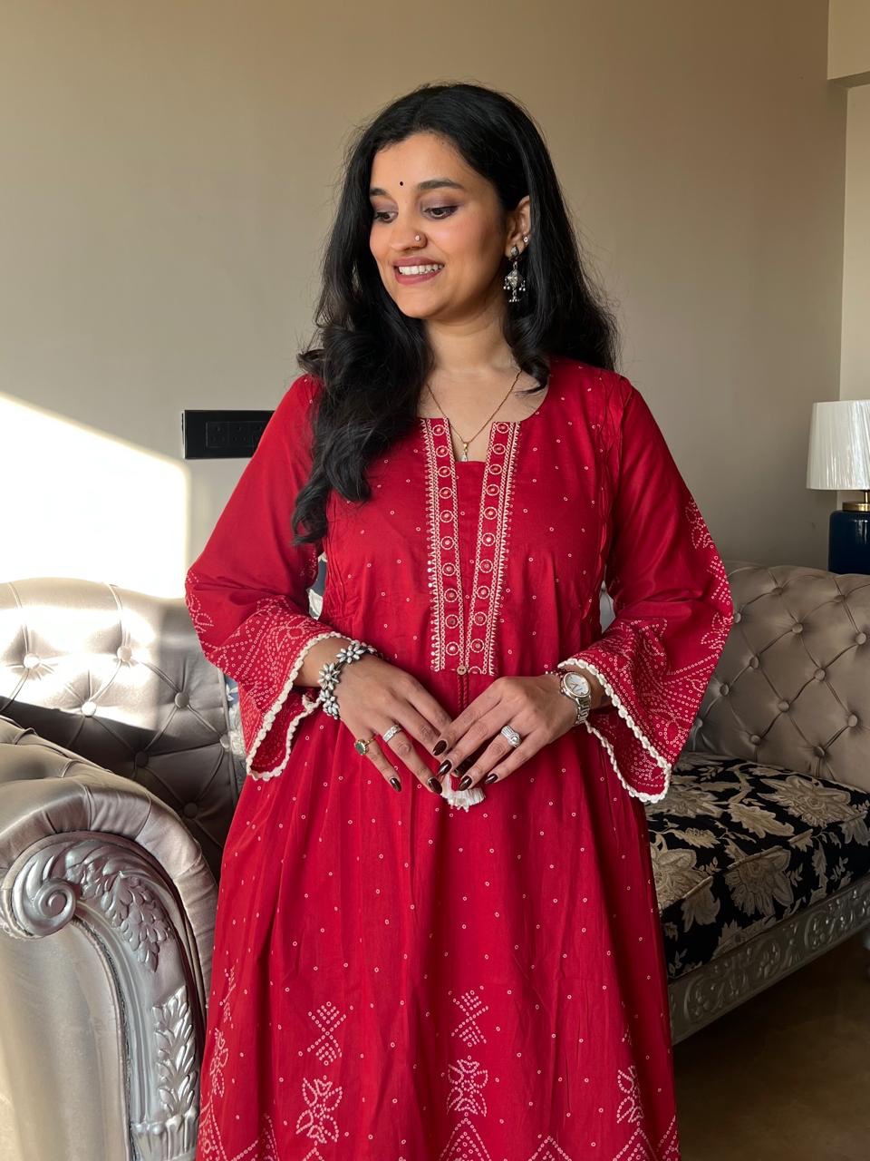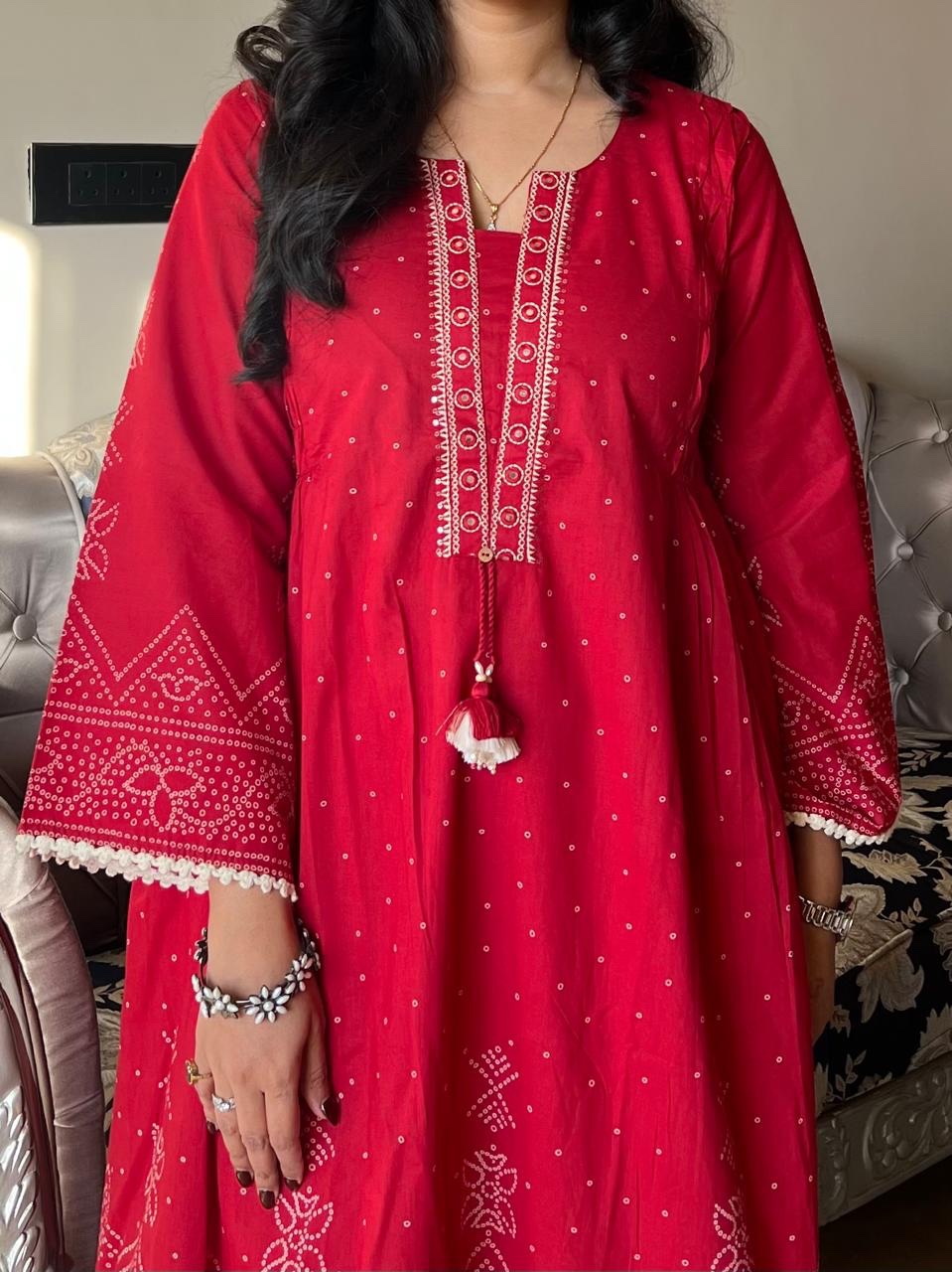 Ramaya Bandhej Flared Set- Red