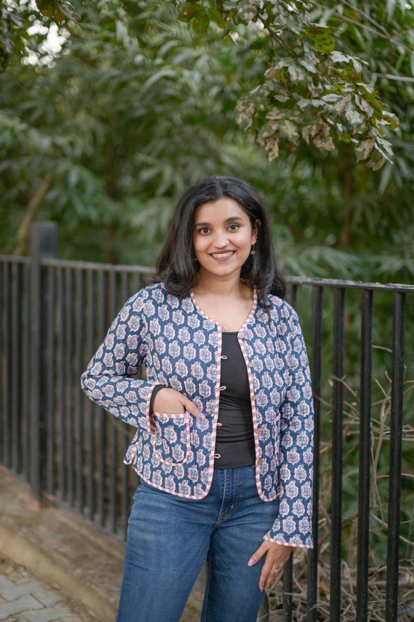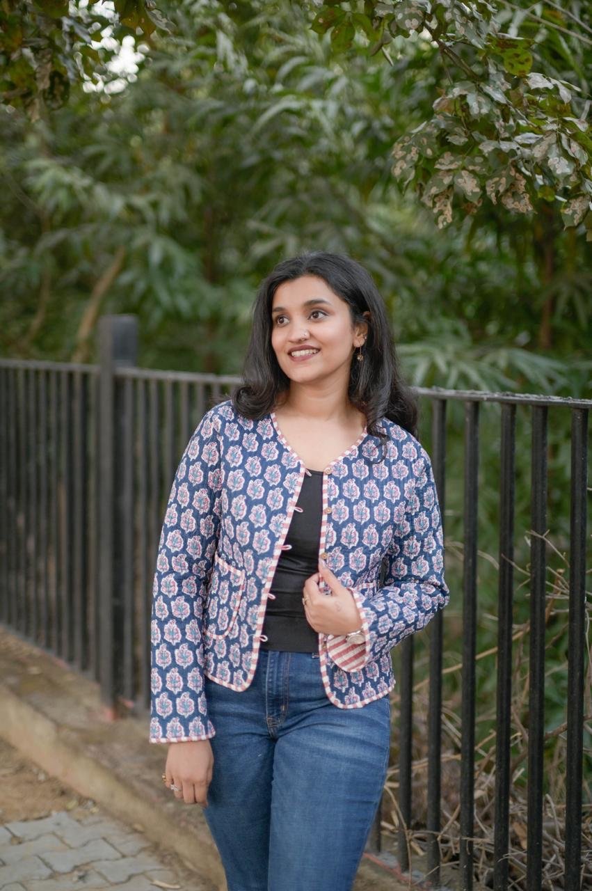Reversible Quilted Short Jacket- Blue Pink Booti